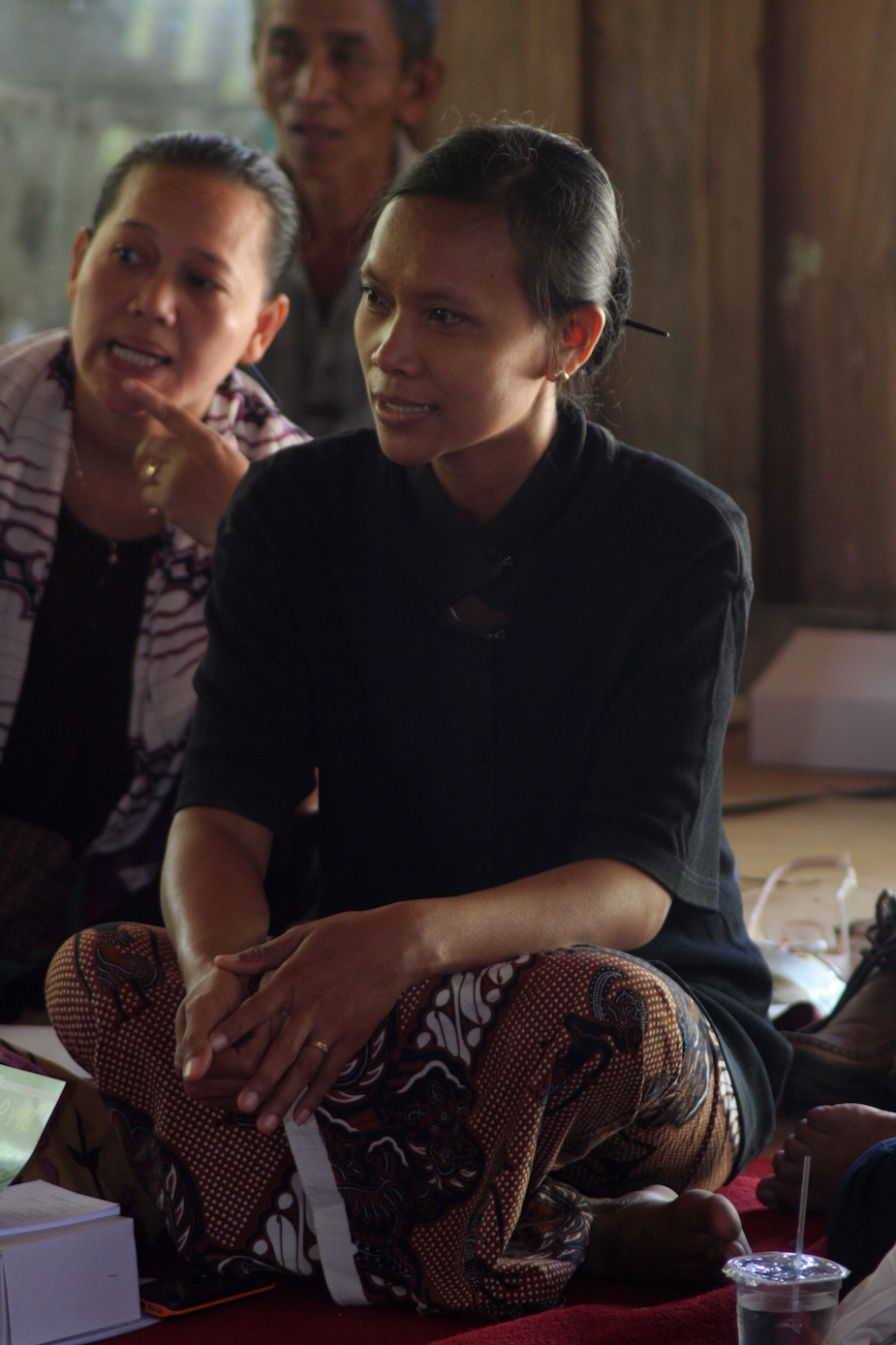 Perempuan itu sudah sibuk dengan pekerjaannya di rumah, sudah tidak bisa ke luar dan memikirkan lainnya. Saya pun menjalani begitu. Saya perempuan bangun pukul 5 pagi dan menyiapkan masakan untuk di bawa ke ladang, terus mengurus anak, merawat ternak. Kalau sempat menyusul ke garapan (sawah atau ladang). Tapi garapan ladang tidak bisa hanya dikerjakan oleh laki-laki melainkan semua keluarga, termasuk saya. Tapi kehidupan yang baik yang tenteram bukan hanya tergantung pada sandang dan pangan, melainkan lebih jauh tergantung pada nilai-nilai hidup yang menyeimbangkan kehidupan manusia dan alam. Kita tidak perlu pandai melainkan yang penting adalah mengerti dan memahami apa yang baik dan buruk. Inilah yang musti kita wariskan pada anak-anak.