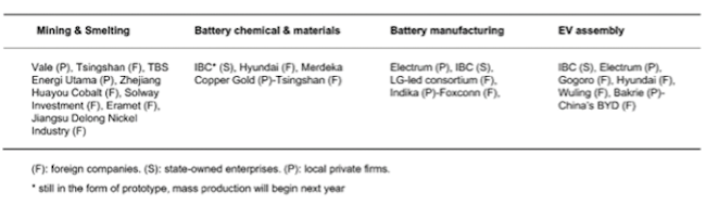 While Chinese and Korean investors provide capital and expertise, the IBC secures their investment and controls risk. New entrants like Korean companies secure their investment with a priori knowledge that the Government will make the project work at all costs. In September 2021, the LG-led consortium (LG Chem, LG Energy Solution, LG International, POSCO, and China’s cobalt company, Huayou Holdings) and IBC launched the first EV battery factory in Southeast Asia, with an investment of US$1.1 billion.