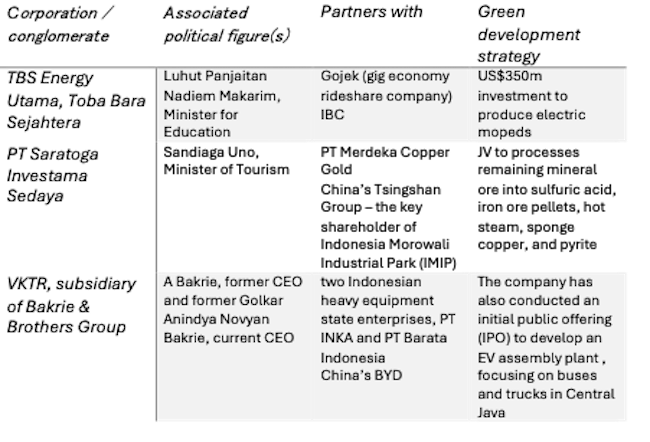Many of the largest extractive conglomerates in Indonesia have aligned their interests within the green development-resource nationalist nexus. The nexus enables them to maintain relevance as local partners despite limited experience in the EV industry. Some of them have established links with smelters in Central Halmahera and Morowali, and access to nickel supplies.