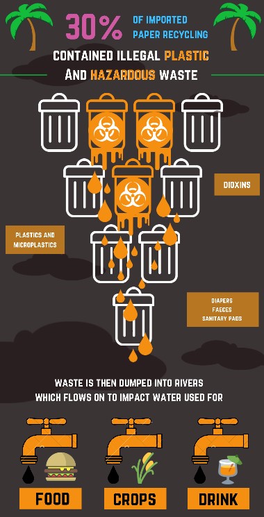 Indonesia’s regulations state that the country can accept recyclable scraps with a two percent contamination rate, but inspectors have found up to 30 percent contamination, meaning almost one third of the imported paper scrap is actually waste product.
