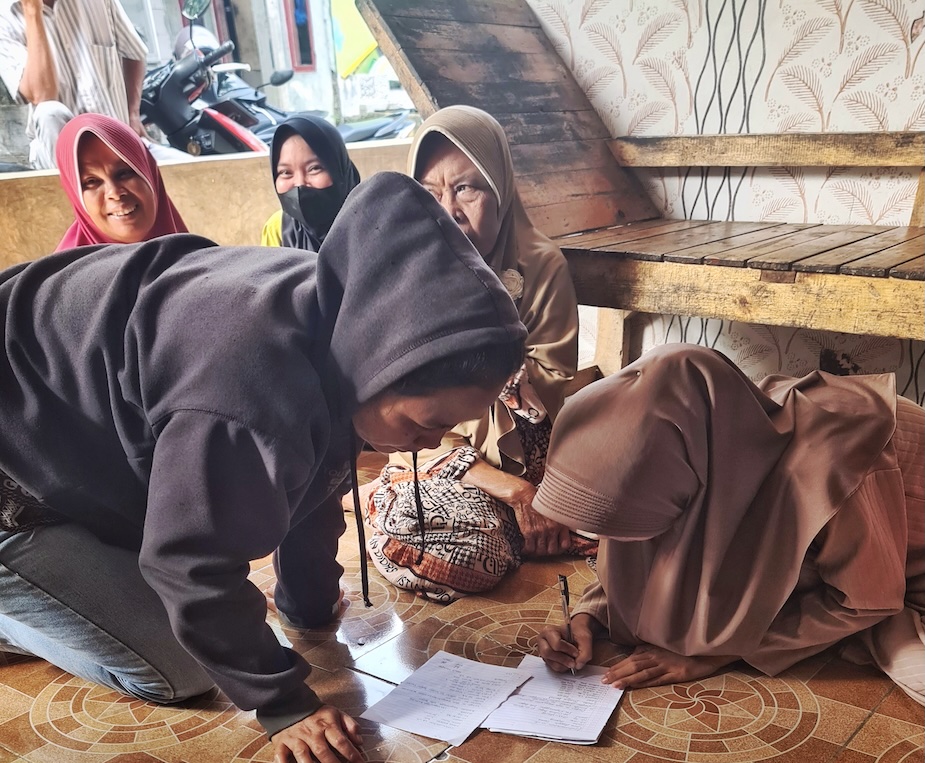 Another participant in the same lending group is 66-year-old Ira, an agricultural worker who relies on others for support. Her hearing impairment developed due to old age, and she never learned Bisindo, the Indonesian sign language. She sees little point in doing so now, as no one around her uses it. She struggles to learn at her age and relies on a fellow group member to communicate with the field officer.