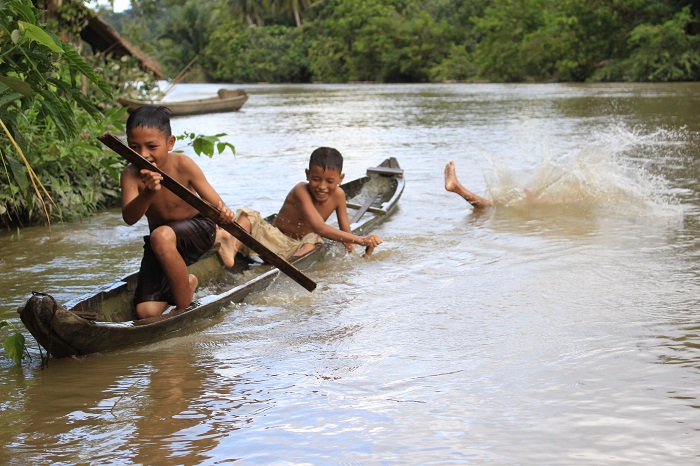 The photos in this collection show another side to the Mentawai Islands – children at play. Children slide down mud tracks into rivers, play klereng (marbles) or invent games using recycled goods. The river becomes a space of play where the life skills of using a boat and swimming become outcomes learned through play. Playing with tyres, or on boats or learning the skills of volleyball are activities far from the grandeur of Jakarta’s stadiums and the discourses of the benefits of sport as espoused by politicians. Playing is an essential element of learning, socialising and enjoying the good life.