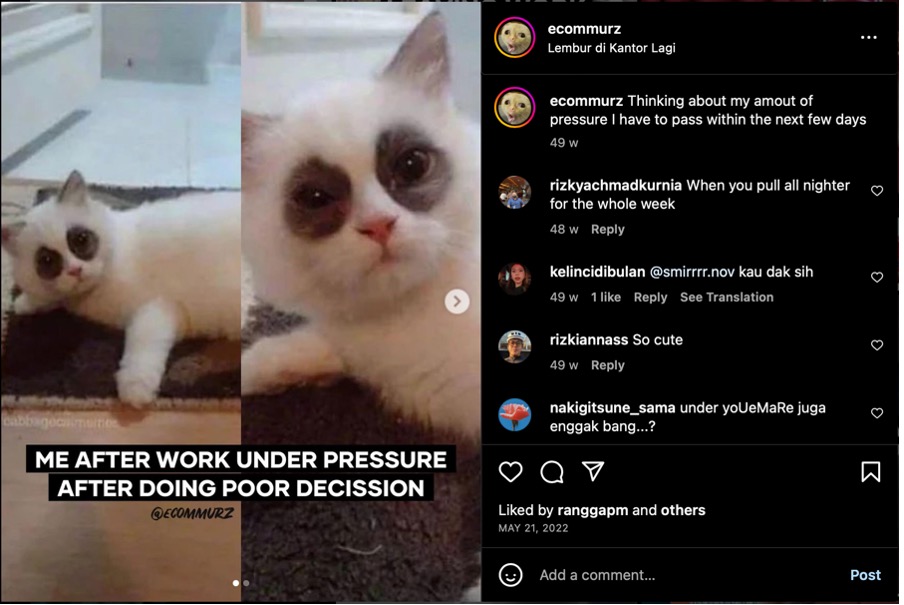 The meme above depicts a cat with a distinct black pattern around its eyes. Text has been added to the picture, saying ‘me after work under pressure after doing poor decision’, while the caption says ‘thinking about the amount (sic) of pressure I have to pass within the next few days’. These captions are accompanied by the location column where Ecommurz writes, ‘overtime at the office again’. The picture connects the black circle around the cat’s eyes with the ways workers’ eyes darken from lack of sleep after pulling all-nighters for overtime. In this regard, the cat offers humorous relief from what is usually considered a miserable situation. The adorable nature of these images contrasts with the stressful working culture that startup employees experience.