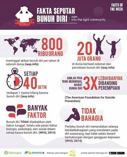 WHO memperkirakan angka bunuh diri pada orang Indonesia adalah 3,4 per 100,000 orang. Namun, ada kemungkinan bahwa angka sesungguhnya lebih tinggi, mengingat bunuh diri kerap tidak diidentifikasi sebagai penyebab kematian selama proses registrasi kematian. Pada saat penyebab kematian tidak diketahui, besar kemungkinan dokter yang cakap tidak tersedia untuk melakukan pemeriksaan. Data nasional tindakan bunuh diri pada kaum muda tidak ada di Indonesia. Namun, riset mengenai bunuh diri kelompok muda di Indonesia cukup mengkhawatirkan. Menurut survei yang dilakukan pada lebih dari 400 penduduk usia muda di Semarang, Jawa Tengah, satu dari tiga pemuda pernah memiliki ide atau pemikiran untuk bunuh diri di masa lalu. Orang-orang ini paham akan metode bunuh diri, yang sering mereka pahami dari pemberitaan kasus bunuh diri di media. Ide dan percobaan bunuh diri juga ditemukan pada kaum muda di bagian lain di Indonesia. Percobaan bunuh diri didorong oleh faktor-faktor seperti depresi dan permasalahan kesehatan jiwa lainnya, permasalahan keluarga, kegagalan personal dan rasa kesepian. Temuan yang paling mengkhawatirkan adalah orang berusia muda cenderung menyimpan sendiri pemikiran bunuh diri mereka daripada bercerita dengan orang lain, sehingga risiko bunuh diri tidak terdeteksi.