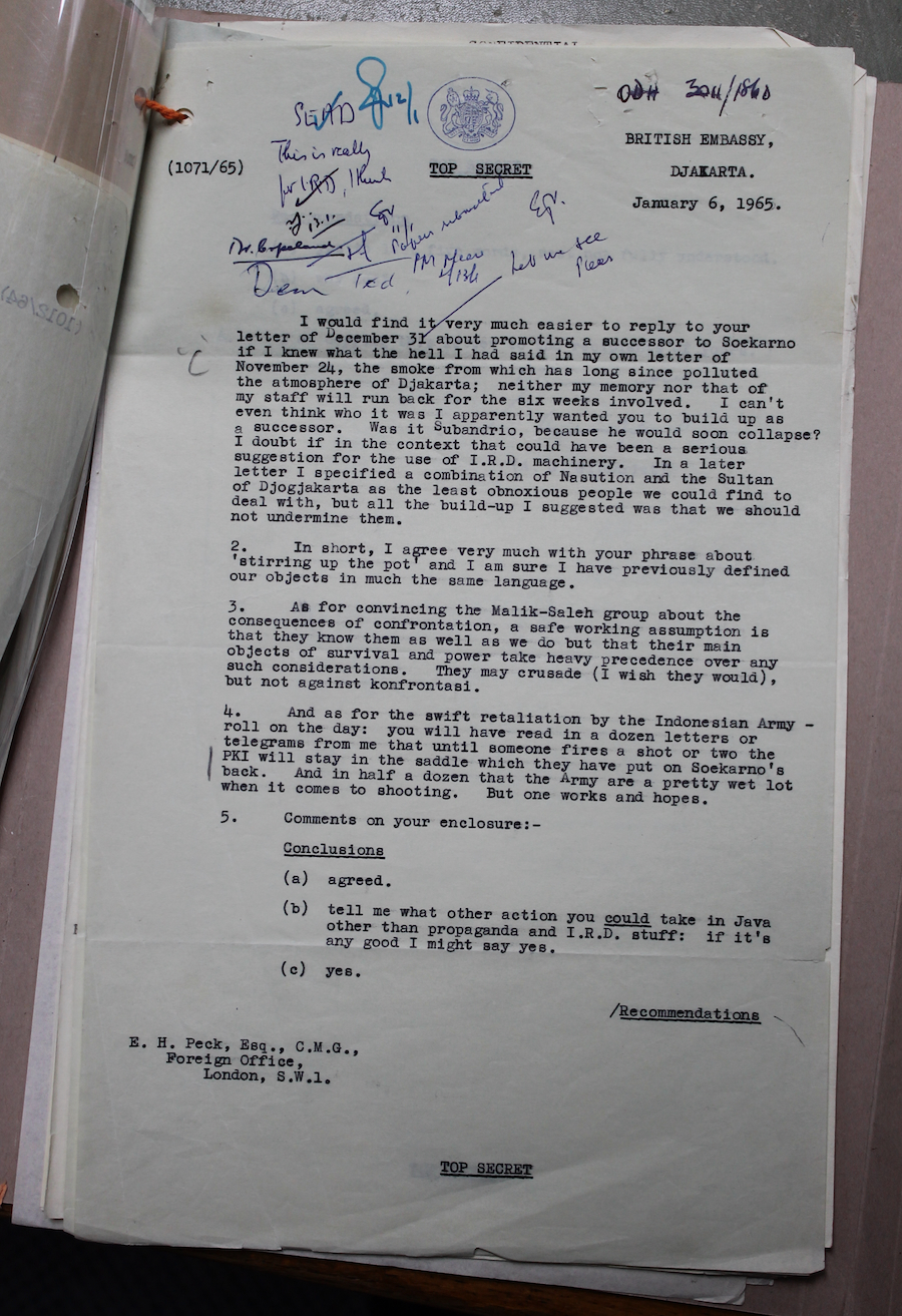 Following the discovery of these files, the way in which the British government attempted to influence events in Indonesia between 1963 and 1966 is clearer than ever. But what motivated them to do so, is not. David Easter argues it was a response to Konfrontasi, the Indonesian government’s diplomatic and military campaign to resist the British sponsored creation of Malaysia in 1963. The PKI supported the campaign and therefore the British wanted them gone. Nathaniel Mehr disagrees, contending that concerns over Konfrontasi were always secondary to the ‘overriding objective’ of preventing the formation of a communist Indonesia, whilst Christopher Tuck posits that the aims for the propaganda campaign changed over the course of October 1965, from ending Konfrontasi to mobilising opponents of communism to crush the PKI.
